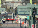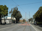 The tracks curve gently into what will now be the Bayview-Hunters Point core corridor and run straight as an arrow for about a mile. Tall, slender palm trees line the center strip between tracks. Following a crossover at Custer Avenue, we reach the station at Evans Avenue, where the Bayview Plaza shopping center is located. The U. S. Postal Service central mail facility is nearby at Evans and Keith. The next stations at Hudson Ave./Innes Ave., Kirkwood Ave./La Salle Ave., Oakdale Ave./Palou Ave. (heart of the Bayview district, sub-named Opera House) and Revere Ave./Shafter Ave. are all island-platform stations, the first ones south of 4th and King. The 24-Divisadero trolley coach line crosses Third Street LRT at Newcomb, after making its terminal stop, and Palou Avenue. Two other bus routes, the 23-Monterey and 44-O'Shaughnessy, cross Third at Palou, with the 54-Felton running alongside, and this station will be one of the busiest on the route.