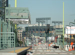 Out Third Street we go, and there are two alternate side-platform stations in the still-being-developed Mission Bay district-- Mission Rock Street and UCSF-Mission Bay (formerly South Street) stations. Looking north, you can see SBC Park, home of the Giants baseball team. Crossing 16th Street, the line will stop again at Mariposa Street, and we are in a gentrifying warehouse area now, and the Union Iron Works Historic District--where hundreds of ships were constructed during both World Wars and in between--lies on our left side. A loop using 18th, Illinois and 19th Street will be constructed to turn back short-turn trains and possibly E-Embarcadero historic streetcars. The terminal loop of the 22-Fillmore trolley coach line parallels the trackway between 18th and 20th Streets.