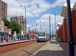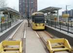 The line to Eccles is the newest portion of the Metrolink system, having opened on July 21, 2000. For this new line, six new two-car articulated light rail vehicles were purchased from Ansaldo in Italy, and numbered 2001-6. To supplement these, three of the original build of 26 units were modified to enable their operation on the Eccles line; the most obvious difference between the modified and the non-modified versions is that the new and modified units have their coupling equipment hidden behind fairings, as only single units may operate on the Eccles line. Whilst modified vehicles may operate on any line, non-modified LRVs may not run to Eccles. This is due to the high percentage of on-street running on the Eccles line; as a result all the series 2 vehicles, and modified series 1 cars, have protective panels across their trucks, whilst the original series 1 vehicles lack these, as the Bury and Altrincham lines have only a small section of street running, in Manchester City Centre. For the benefit of this guide, Manchester will be considered to be North and Eccles to be South.
