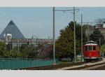 The Riverfront line curves off Main Street just north of Auction Avenue, and a signal guards the crossing of the Illinois Central Railroad's River Line (used by local freights and Amtrak). Trolleys run southbound only. Stops are made at the Pyramid, Monroe/Welcome Center, where people can take the Mud Island Monorail over to Mud Island, Union Avenue, Beale Street Landing, Huling Street, and finally, Central Station. The line is quite scenic, and serves many trendy restaurants enroute. North of Huling, the railroad curves away from the trolley line and the trolley route continues to Tennessee and Calhoun, where a number of old factories have been converted to lofts, apartments and condominiums. After the stop under the railroad at Central Station, the line reaches Main Street and the Riverfront cars will then run northbound on Main Street.
