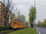 On weekday mornings, an impressive 5-car train runs as a school tripper on the Limbiate line, bringing a huge load of "Ragazzi" into Affori terminal. This train is comprised of one of the remaining "Désio" or "Reggio Emilia" class interurban motors and the last four serviceable trailers. These motors were built in 1926 and 1928, respectively. "Désio" 46 and "Reggio" 85, 90 and 92 are assigned to Deposito Varedo, which serves Limbiate, with car 90 equipped as a snow plow. At Désio, cars 47, 48 and 89 are operable, but not regularly used. Car 44 serves as a shunter at Teodosio Workshops, which adjoins Deposito Leoncavallo on the urban network. Cars 45 and 87 also are still in existence, but are stripped.