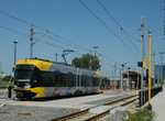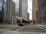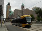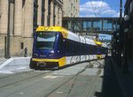 Minneapolis "Hiawatha" light rail trains in test operation at Warehouse District/Hennepin Avenue. Photo by Gary Ulmer, June 24, 2004.