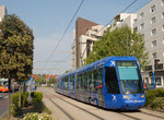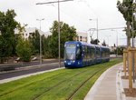 This city, located just a few kilometers inland from the western shore of the French Riviera along the Gulf of Lion, has a population of 230,000. On July 1, 2000, some 51 years after abandonment of Montpellier's first tramway network, the city instituted a brand-new 15.2km tramway line, the "Blue Line". 28 Alstom Citadis low-floor trams, model 301, instituted the new service. They were originally 6-axle trams, but beginning in mid-2002, were subsequently lengthened to 8-axle cars by insertion of a second bogie and suspended section aft of the section which contains the pantograph.