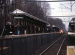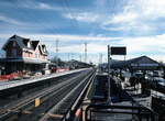Continuing east, there is a moderately large gap between Hazlet and our next station, Middletown. This nice station has two new high platforms with wrought iron animal sculptures featuring a rooster, fox, birds on a branch, horse and a deer in the platform railings. The station varies from embankment to near grade. A crossover is at the west end of the station. No trace was found of the old low platforms.