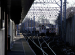 Just after Monmouth Park, we cross Branchport Creek and enter the city of Long Branch, Monmouth County's largest city. We cross Chelsea Av. and then curve to the south, stopping at Long Branch, the last station in electrified territory. This station has a high island platform and a small station house on the platform. While both tracks have catenary, normal operations have electric trains terminating on the westbound tracks and diesels from Bay Head on the eastbound track. The platform has three heated indoor waiting areas along with a crossunder to parking and street. The ticket office is in the middle one of the three waiting areas. Passengers board a diesel train and then continue their journey.