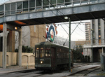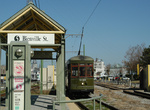 In the summer of 1988 the lonely St. Charles Line got some company again when the first new streetcar route in New Orleans since the mid 1920's opened for service. Unlike the St. Charles line, the new Riverfront line is more of a tourist route running along the Mississippi River, connecting the Convention Center and Riverwalk shopping area to the French Quarter and ending at Esplanade Ave. (French Market). The Riverfront line runs entirely in its own right of way, and its stations consist of ground level island platforms with canopies between the tracks.