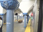 The platform area has a brown tile floor, and walls painted in a black, blue, white scheme, with "PATH" logos stenciled on a center stripe. The thick columns are tile around cast iron, the plain iron tops of which are painted powder blue.