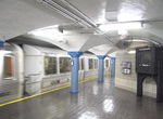 This station is of unusual configuration: two tracks, one island and one side platform. The island platform is narrower than other island platforms in the system and has a fairly low, arched ceiling. A number of stairways from the island platform lead to a mezzanine level. The narrow platform, low ceiling, and many stairways lead to a claustrophobic feeling in this station especially during rush hours.