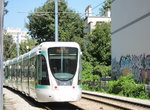 Line T1, which runs through several working-class suburbs, is not especially scenic, and is downright gritty in some locations. But the service is fast and frequent. La Courneuve 8 Mai 1945, where connection is made to Métro line M7, is an especially busy stop, with open air markets adjacent to the station, and sometimes trams take five minutes to unload and load passengers! Along the way, T1 passes over several SNCF railroad yards. The new extension to Noisy-le-Sec carries the line over a canal, and does street running within the suburb. The carbarn is located at Bobigny, sharing space with Métro M5 trains.