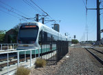Once double track resumes, the line is fast and the signals are pre-empted (for the most part). Stations are located at 38th Street/Washington and 44th Street/Washington, where riders can transfer to the free shuttle bus to Phoenix Sky Harbor International Airport. (A people mover will be built, replacing the bus.) Following 44th Street, the line continues eastward. Just before passing under the Arizona 202 freeway, there is a two-track access route to the Valley Metro Light Rail Maintenance Facility, which is visible from the freeway. Entering Tempe, the route curves gently toward the southeast, and the station at Priest Drive/Washington is reached. Another station is located at Center Parkway/Washington before turning southeast and crossing the Salt River and into downtown Tempe. The bridge across the Salt River parallels the Union Pacific trestle bridge. Next comes Mill Avenue/3rd Street in downtown Tempe. The old grain elevator, a symbol of old Tempe, is north of the station. The next station is Veterans Way/College Avenue at the Tempe Transportation Center and the beginning of the route through the Arizona State University campus. Sun Devil Stadium is nearby. The second station serving ASU is University Drive/Rural Road. Following this stop, the line runs down Terrace Road toward Apache Blvd., where the route makes a 45º turn east. Along Apache Blvd., stations are located at Dorsey Lane/Apache Blvd., McClintock/Apache Blvd., Smith-Martin/Apache Blvd. and Price-101 Freeway/Apache Blvd. The end of the line, in Mesa, is Main/Sycamore. There are tail tracks to lay up trains here (similiar to those at Montebello/19th Avenue).