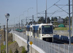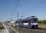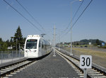 Inbound MAX Green Line crossing one of two grade crossings on the line at SE Flavel. Photo by Peter Ehrlich, September 2009.