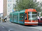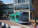 Portland Streetcar no. 007 inbound at SW 5th/Montgomery. Photo by Peter Ehrlich, September 2009.