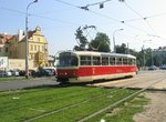 Tatra T3 on the Manesuv Most (bridge), tram route 18. Photo by David Pirmann, May 2003.
