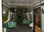 Internal: Seating has been improved, giving up the scoop seats in favor of comfortable benches (those who are more than skin and bones will rejoice) in bright colors. Pattern is now parallel across from front/back facing -- rather like the R-62 cars, but with one side shifted from the other, so that the front/back facing seats are opposite benches which are parallel to the side of the car. Unfortunately, some seating space has been sacrificed in order to allow for the wider doors. Interior surfaces are smooth fake-granite fiberglass (or plastic?) -- which is apparently quite resistant to graffiti, and also quite cheap to replace when necessary.