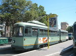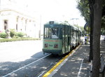 The largest group of single-end trams are the 6-axle 7000s, built in two groups. Cars 7001-7099 (again, odd numbers only) were built by Stanga in 1949-50, while 7101-7115, very slightly longer, were built by Viberti in 1954. All of the 7000s sport electronic destination signs, and some have been rebuilt, and these have returned to the classic 2-tone green livery. Although most of the 7000s have modern-style bow collectors, a few have received single-arm pantographs. All 58 cars are still in active duty.