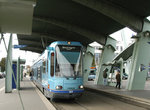 The Techopôle line is longer and more interesting. Between Europa and Hôtel de Ville-Sotteville, it's street running most of the way, and the sights include an open-air market. At Hôtel de Ville-Sotteville Station, a massive cantilever canopy covers both tracks. Then the line winds its way through the suburb of Sotteville-les-Rouen, occasionally in the center of streets and sometime in side-of-road reservation, passing several parks (including Le Parc in St.-Etienne-du-Rouvray), finally reaching Technopôle. Unlike George Braque, cars unload passengers, head into a pocket track and change directions before heading to the inbound platform.