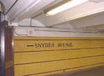 Snyder station is next on the line, and sits in a cluster of local attractions. Methodist Hospital, and South Philadelphia High School are nearby, with shops along Snyder Avenue itself. This sat as the southern end of the Broad Street Line for 34 and a half years, with extensions to Pattison opening in 1973. The station's columns are colored maroon, and the mezzanine level walls are yellow with maroon accents. Floor tile on the platform is light gray with maroon accents, and the station signs are located in a long band of stainless steel that runs the length of the center of the ceiling over the platform, broken only where the staircases are located. Originally, the silver parts of the steel band were covered with orange plastic strips, and the station signs referred to the stop as "Snyder Ave."; this was changed when the rehab work was done (before that, the maps had dropped the "Ave." from the station name, this was done at least since 1984). Exits lead to all four corners of Broad Street and Snyder Avenue, with the northeast corner having an escalator. Above, passengers can board the former trackless trolley (electric trolleybus) route 79 on Snyder, and the 37 bus on the west side of Broad (it terminates at the station). An odd thing about this station is its alignment under Broad Street. If you look north of the station, there's an oddly placed crossover switch. Track 2 (southbound) through this station is track 1 (northbound) through the next station, and track 1 through Snyder station (as well as southbound track 2 from further north) merges into the same through track, as well as crossing over to the southbound track from the next stop. Southbound trains must travel at reduced speeds when entering, while northbound trains departing leave at normal speeds. Additionally, there is an odd jog in the tunnel, as if it was once intended for the tracks to bypass the station; this is the location for an intended but never built spur under Passyunk Avenue (to probably the same areas served by Route 37). Snyder station opened September 18, 1938.
