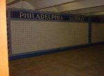 Around a slight curve to the west from Walnut-Locust, the next station is a big one, and is both popular AND notorious. City Hall is next, the original southern terminal of the line. This stop is the ONLY one to not have any plastic wall or ceiling signs; the station name is found only on a new style of billboards on the walls, and in tile mosaic on the platform dividers. This is also one of only two stations on the main line to not be aligned physically beneath Broad Street (the other is Fern Rock, which is at 10th and Nedro, and not under Broad Street (or anything else, for that matter) at all), but instead sits under the west face of City Hall, at 15th and Market. The building foundations of the main center of government in Philadelphia extend into the station, dividing the two island platforms, and separating the northbound and southbound sides of the station. There are passages between them, however, allowing one to walk from one side of a platform to the other without going upstairs first, as both Express and Local trains stop here, and it's easier to see an approaching Local from the Express side, due to the curves. The tile on the walls is off-white, with red and maroon accents in the foundation walls between the tracks. These tiles are smaller, bathroom floor-stye tiles. Tile on the platform dividers is mostly white but with tones of cream and maroon coloring (not as deep red as Lombard-South, though). There are steel support columns visible at the extreme north and south ends of the station; these are painted orange and white. Market Street passes above the center of the station, as does the Market-Frankford Line, and you can easily hear and feel a train passing overhead. The Subway-Surface trolleys (routes 10, 11 13, 34, and 36) can be heard at the northernmost end of the station, and given the curves in the tunnel on the line at this point, it can be tough to tell if the sound of a train arriving is actually a trolley upstairs. There is capability for free interchange to the Market-Frankford line and the trolley routes here, and a total of four exits, though the construction and exit numbering of the stop shows evidence of six. There are narrow walkways above the central point of the platforms, where the stairs to and from the Market-Frankford Line are located; this is to prevent overcrowding on one staircase, as at least three on each side lead up to the mezzanine level. Exit 1 leads to the South Broad concourse and South Penn Square. There is a sign outside the paid area identifying this exit as "South-Penn", and it is exit only. Exits 2 and 5 have been removed. Exits 3 and 4 lead to the Market-Frankford Line free interchange, and to additional exits from the subway system to Richardson Dilworth Plaza (west face of City Hall) or into the City Hall courtyard, or Juniper Street (east face of City Hall), and into the Market East Concourse. Exit 3 leads to the trains eastbound to Frankford, Exit 4 leads to the trains westbound to 30th Street and 69th Street Terminal. Exit 6 leads to the Subway-Surface trolley lines, and a high wheel exit leading to the Penn Center Suburban Station Concourse and the Regional Rail Lines. Numerous bus routes connect here, and there are many municipal buildings in the area, as well as several shops, banks, and a few lunch spots, all leading to this being the most highly used station on the line. North of the station, the tracks make a right-left reverse curve to align themselves under North Broad Street before continuing on. City Hall station opened September 1, 1928.