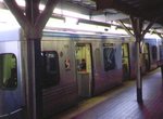 We pass through 19th and 22nd Streets on the center "express" tracks, while the subway-surface cars serve these local stations on the outermost tracks. We cross under the Schuylkill River and arrive at 30th Street. 30th Street has an island platform serving the two heavy rail "express" tracks and two low level wall platforms for the subway-surface cars using the "local" tracks. The island platform has a brown tile floor. The sidewalls of the low platforms have green accents with blue/gray top and bottom, featuring an New York IND style tile stripe. The main wall color is cream. There is a full mezzanine which once had a direct entrance to the 30th St. Station (which serves Amtrak and the Regional Rail lines), but was closed due to crime concerns. Signs are blue and the I-beams are wrapped with stainless steel. This station was recently renovated with accessibility improvements. These include new signage, tactile warning strips, elevators, and entrance improvements. The existing entrances became sort-of kiosks and a new "master kiosk" entrance was created. It includes benches, skylights, an elevator and stairs. The stairs and elevator lead underground where there is still a big space, open to street level. It should be seen in person to really understand what I'm saying.