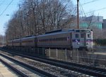 R3's leave the ex-Reading trunk after the Jenkintown station and take a generally northeast heading, almost arrow-straight, through the eastern reaches of Montgomery County. The line stays in a shallow cut as it runs around the northwestern edge of Jenkintown, calling at Noble station at Old York Road in a busy commercial area in this section of Abington Township. From there, the line begins to climb onto embankment, whizzing through a grade crossing just east of Old York Road and calling at Rydal and Meadowbrook stations. These stops are in a fairly sparsely settled area and are not very busy. Just northeast of Meadowbrook, the former Newtown line crosses at grade. There is occasional talk of resuming commuter service on this line, possibly tying it into R3, but nothing has materialized despite the extremely large residential growth in the Newtown area.