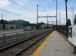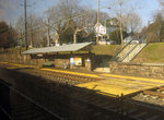 Our first stop is Levittown/Tullytown. The station is at grade level, with a fieldstone station building on the west side of the tracks. There is a short canopy over part of the platform. Our line rises to an embankment and we enter our next station, Bristol. The current station building is on the west side, and there is an old station building in need of renovation on the east side. The station is fairly high off the ground due to having been relocated from the original right of way through the center of Bristol. The platforms are concrete and have a short canopy. While the platforms are low, they have nice canopies and rails on the rear such as might be found on a high platform station. This station can barely hold six cars, the front half of the first car and the rear of the last car is off the platform. (There are no center doors on SEPTA trains.) The line descends to grade and we enter Croydon. There is a brick bus shelter on the southbound platform.