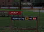 R1 trains leave 30th Street Station and share tracks with R2 Newark/Wilmington and R3 Media/Elwyn trains through a subway beneath 32nd Street, which ends at Walnut Street. The line is in a short cut behind the locally-famous Palestra, the University of Pennsylvania's basketball arena, and Franklin Field, its football stadium. Just past South Street, the University City station appears. This was completed in the early 1990's (it was originally going to be called Civic Center) and opened up several ridership possibilities in the nearby university area - both Penn and Drexel - as well as the hospital complex on Civic Center Boulevard. The former Conrail "High Line" freight bypass around 30th Street is just east of the station. The station has two entrances: stairs from South Street, and a larger entrance on Convention Av which features wheelchair accessibility, a ticket office, information, and an electronic display. The platform level has a roof and the platform is a neat concrete diamond pattern with tactile edging. This station is very nice.