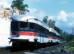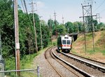 Just north of Villanova, beyond the crossover, the line curves sharply eastward. At the curve, the alignment of the former Strafford branch can be seen straight ahead. Although the tracks have been gone for 45 years, the grade is still visible, and a bicycle trail has been proposed for this right of way. Your train vaults over Lancaster Pike (US 30) into the busy Radnor stop. Radnor has become an important reverse commute location, with major employers nearby (among others, TV Guide calls Radnor home). After another quick turn to the right, you pass under the Amtrak Main Line to Harrisburg (where SEPTA's Paoli/Downingtown R5 electric trains run) and begin to parallel I-476 (known locally as the Blue Route) behind the noise wall on your right). County Line stop passes and you cross from Delaware County to Montgomery County as you curve to the left away from the unseen highway.