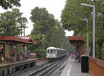 Jefferson Avenue is next, which has canopies over the only exit at the north end, to Jefferson Ave. Jefferson Ave. crossover, two manual switches, is visible from the north end. This station begins the descent from the embankment to the open cut of the next few stations.