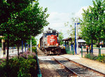 South of Broadway, the route makes a gentle curve to the southeast and crosses busy but narrow Freeport Blvd, into 4th Avenue/Wayne Hultgren station, another walk-in facility serving the working-class neighborhood of Curtis Park. McClatchy High School is located nearby along Freeport Blvd. Another half-mile or so of riding will reach City College station, which is bordered on the west by the campus, parking lot and Hughes Stadium, and on the east by the old Western Pacific South Sacramento freight yard. One can usually see a UP GP-38-2 or similar locomotive idling here as it waits for assignment. Looking north, one can see the Sacramento skyline--a nice backdrop for an approaching outbound train.