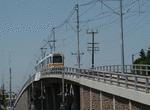 The line remains in the I-80 median until reaching the next stop of Roseville Road. After leaving Roseville Road, double track resumes. The line continues on the abandoned freeway structure until reaching the Union Pacific right of way, which it will follow the next few miles. The next stop is Marconi/Arcade followed by Swanston. The main train yard for the system is located between the two stations. Right after leaving Swanston, the line becomes single tracked and veers away from the Union Pacific right of way. A series of sharp curves are then negotiated to reach the next station, Royal Oaks. The line then uses an abandoned Sacramento Northern right of way that follows city streets. The tracks parallel Arden Way until reaching Arden/Del Paso. The tracks then run down the middle of Del Paso Blvd. to reach the Globe Avenue station. After leaving Globe Avenue, the line becomes a single track to cross the American River and some railroad tracks. The line does not get its own bridge, but rather a reserved lane on the bridge for Del Paso Blvd. As the line nears downtown, it starts running down 12th Street, which ducks under the former Southern Pacific main line just before arriving at the Alkali Flat/La Velentina station. Since 12th Street is one way, the track going against traffic gets a reserved lane. The other track shares its lane with street traffic. A stop is made at 12th & I a few blocks before the tracks turn onto K Street. The five blocks of K Street shared with light rail have been converted into an auto free pedestrian mall. The Cathedral Square and St. Rose of Lima Park stops are located along the K Street mall. At the end of the K Street mall, the tracks turn and head south along 7th and 8th, two parallel one way streets. This is also the area where a future extension will branch off to reach the Sacramento Amtrak station, five blocks away. The next stop is at Capitol Mall (7th & Capitol and 8th & Capitol). From these stops, the California state capitol building can be seen at the end of the mall. The tracks continue down 7th and 8th until reaching O street, where they turn east and come together again. Trains stop at 8th & O and then Archives Plaza before turning south on 12th Street. As the name suggests, state office buildings line this section of O Street. This time, the tracks only stay on 12th street for two blocks before turning east and leaving street trackage. There is a small three track yard located at the corner where the tracks trun. The "R Street Yard" was one regularly used to turn extra cars removed from eastbound trains. The next two stops, 13th Street and 16th Street, are connected with a short section of private right of way that parallels R Street. As the trains make their way along the private right of way, cross streets are blocked with crossing gates. This is a feature common on the rest of the line east towards Folsom, but almost non-existent on the northern part of the line. Upon leaving 16th Street, the South line tracks split off and follow the Union Pacific Railroad tracks 6 miles south to Meadowview Rd., and the original line climbs up onto the "Bee Bridge". Originally a single-track bridge, a new viaduct for inbound trains was constructed in conjunction with the South Line project. This bridge is so named because of its proximity to the Sacramento Bee newspaper plant. The old Western Pacific main line (of California Zephyr fame) is crossed here. The tracks return to grade level next to The Sacramento Bee building and the 23rd Street station. The Bee is Sacramento's main newspaper.