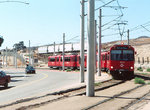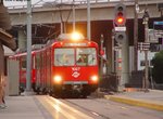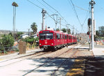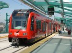 The tracks finally leave C Street as they curve and enter the America Plaza transfer station. The station is located between two buildings and has an overhead canopy. A block later, at the side of the Santa Fe Depot, the line splits. Orange Line trains turn left to head south on a shot stretch of track that gets back to 12th & Imperial. Blue Line trains turn right and head north in front of the Depot. The Santa Fe Depot trolley stop is located between the Depot and the mainline railroad tracks used by Amtrak, Coaster and an occasional BNSF freight. Coaster is a clone of Los Angles' Metrolink commuter train and goes between San Diego and Oceanside, where Metrolink service begins.