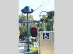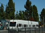 As the tracks leave Mountain View, they merge to a single track and continue to parallel the Caltrain tracks. The next station, Evelyn, is a single track station, whose only access is through a pedestrian tunnel under the Caltrain tracks. After Evelyn, the light rail tracks curve away from the Caltrain tracks, crossing the adjacent street. An interesting feature of this crossing, is that the northbound lanes have an additional crossing gate. This secondary gate comes down only a foot above the road and appears to be a physical barrier to stop errant automobiles. Once across the street, the line cuts through a new housing development and becomes double tracked, stopping at Whisman and Middlefield. The line then skirts the edge of Moffett Field (NASA/Ames), stopping at NASA/Bayshore and Moffett Park on its way to its way to Lockheed Martin.