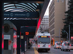 At the end of the transit mall, the tracks turn and head west, coming together again after crossing each other. The line heads west for several blocks, stopping in front of the Convention Center, before turning south again and stopping at the Children's Discovery Museum. The station is designed to look like part of the museum building, and is the most unique looking station on the system.