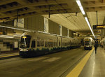 SeaTac International Airport. Island platform with two side trackways. A mezzanine level under the platform level connects to one of the SeaTac parking structures, through which is a long corridor leading to the terminals at the north end (C/D/N gates). (The airport itself features three automated peoplemovers connecting the gates.)