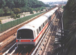 Operation is totally automatic. In fact, there is no cab; the trainsets have a similar appearance to airport peoplemovers -- with a covered drivers' console that can be used in an emergency. In a throwback to tradition, there are two railfan windows, one at either side of the front car. In automatic operation, dwell time is set and doors close automatically after a warning signal. I saw no door holding at any time, even during rush hour. There are supposedly roving customer service personnel; I thought I saw one sitting in the middle of the train. He wasn't wearing a uniform, but was holding a two-way radio.