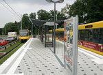 After a short section of grassed reservation the tracks twist in the narrow Schmidener Straße. At the end of the twisted section the tracks change from the side reservation to a central reservation and reach the Obere Ziegelei station (side platforms.) Here was the terminus of the former tram line, which reversed via a loop.