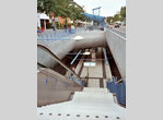 A steep ramp leads to the city light rail tunnel. The tunnel starts with the Charlottenplatz station with high and low side platforms. This station in level -1 opened on May, 17th 1967. On level -2 the lines U1, U2 and U4 intersect (descripted on line U1). Until Oktober, 1st 1978 over a tempory ramp at the other end of the station the trams reached the surface again. Then the connection tunnel between here and Hauptbahnhof opened with the curved Schloßplatz station in the center of Stuttgart. The station is desigend by Behnisch and Partner, the achitects who also built the Munich Olympia tent-ceiling. The four underground station have 120m long platforms, 80m high level and 40m low level for the tram line.