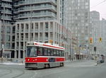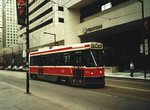 The 510 route opened in two parts - the Harbourfront LRT from Union Station to Queens Quay and Spadina in 1990 and along Spadina Ave. from Bloor to Queens Quay in 1997. The Queen's Quay part was opened as part of the waterfront redevelopment. It is amazing that in a few years, Queen's Quay went from grimy rust belt industrial to trendy condo and antique mecca. The route was originally operated with rebuilt PCCs and operated from an underground loop at Union Station south under Bay Street in Toronto's only streetcar subway to an underground station at Queen's Quay and Bay. The streetcars then turned west and emerged from the portal to run along the centre of Queen's Quay in a private right of way. Six stops later, the line ended at Spadina in an off street loop. The noise the PCCs made in the loop irritated the condo dwellers who convinced the TTC to change to CLRVs in 1993. Most railfans wonder about this since the PCCs are no noisier and in fact weigh less than the CLRVs. There was a right of way to connect the Harbourfront LRT to the rest of the streetcar system along Spadina from Queen's Quay to King.