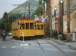 Three streetcars meet in Central Ybor at 8th Ave & 17th Street, with Gomaco replica no. 428 in the lead. Photo by Bob Pickering, October 2002.