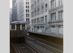 Leaving the station behind, we curve sharply toward the west and find ourselves above Lake Street. This curve was the site of a 1977 derailment that sent three "L" cars plunging to the street below, killing eleven people in the CTA's worst rapid transit accident to date. Heavy steel beams have since been placed along the outsides of sharp curves, designed to prevent a derailed train from falling to the street. Other than these beams, little evidence remains of this curve's notorious past.