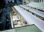 Emerging from under the canopy, we soon enter the station at Washington/Wells (100N/200W). Wide side platforms are spanned by large canopy with exposed steel trusswork painted white, and elevators and stairs lead to fare control on a mezzanine below. An elevator, escalators, and additional stairs lead from the mezzanine to either side of Wells Street below. The mezzanine allows transfers between either platform while remaining inside fare control. This large station, completed in the mid-1990's, is the second-newest station in the Loop (Library-State-Van Buren now being the newest). The station also has exit-only stairs to Madison Street below, but there is no trace left of the old Madison / Wells station that once stood here.