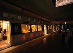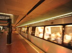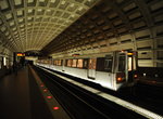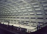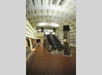 Metro Center (lower level). Next, we arrive at Metro Center's lower level platform. The connection to the WMATA Red Line is upstairs. There is a low ceiling, similar to that at L'Enfant Plaza, and only the station's waffle sidewalls are visible, due to the upper level's pod covering the entire length of the platform. Lighting here is better than at L'Enfant Plaza. Sometimes, trains are held briefly in order to connect with Red line trains arriving above. Congestion is common here; and sometime train traffic backs up. Just north, the tracks take a sharp, 90-degree turn from 12th Street NW into Eye Street NW. Metro Center station lower level opened July 1, 1977.