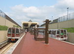 West Hyattsville. After ducking into and out of tunnels twice, we arrive at the West Hyattsville station. This elevated station is located just west of Ager Road near the intersection of Queens Chapel Road. It sits a considerable distance back from the street. It features neither a peaked nor gull-wing roof; rather, a series of concrete bars link the roofs of the two side platforms. There is a full mezzanine below the platform's north end, where the exit is located. At this end of the station, the tracks veer off to the left and dive underground. At the opposite end of the platform, there is a 90-degree curve, after which the tracks once again plunge beneath the ground. This station was originally to be named "Chillum", after the neighborhood of the same name, but was later changed to its present name. West Hyattsville station opened December 11, 1993.