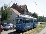 Finally, and least numerous, is the classically styled Duwag GT6 type. Of a batch purchased second-hand from Mannheim during the 1990s, a handful remain in use; most are to the traditional Duwag style, but a handful are the slightly more angular 'type Mannheim' variant. It would seem that all those remaining in use carry some form of all-over advertising livery; The standard ZET application is now plain blue, which has superceded an attractive blue and cream colour scheme. The Duwags will also be replaced by new low-floor cars imminently.