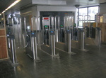 West Lake. Two side platforms, two tracks, ground level. This station was opened on December 22, 1979. The walls along the platforms are tiled and colored in a way that makes wide, diagonal stripes along them, the colors are a rainbow of warm colors. There is a blue strip along the tops of the walls with the station name written out and "All stations are under camera surveillance." (The only station I've seen with this written, draw your own conclusions.) There is a steel truss roof.