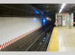 R Just prior to entering Bay Ridge Avenue station, daylight is briefly visible as the tracks pass over the Bay Ridge Branch of the LIRR. The station has two side platforms with blue accent tile. The north exit at 68th St. is an iron maiden exit, and the south exit has a mezzanine and crossover. No mosaics were observed, either in the tile band in the mezzanine or elsewhere.