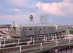NW Two side platforms, three tracks. Full windscreen treatment along the platform. The exit to the mezzanine is in the center and is accented with bright blue at the top of the stair cutout. The back of stairs are red as are the skirt boards of the stairs and the lower woodwork in the mezzanine. The mezzanine itself is clad wood and has an extra exit to the west. There is a free crossunder. A view of Sunnyside Yard can be had through peepholes in the windscreen and from the mezzanine. The rails around the stairs are light blue in color. A two story tower is just to the south of the station in between the two tracks, the third track ending just north of this tower. The station is 2.5 stories above the ground.