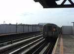 At 9th Avenue, the West End Line uses the upper level. There used to be a pedestrian crossing over the center express track at the north side of the station that also provided TA employees access to the 36th Street Yard. Until recently, there was never a "no admittance" sign; in the last few years, one was erected. That perch provided for some great shots of trains coming from the 4th Avenue subway. However, good shots can still be taken from the platform level.