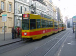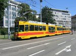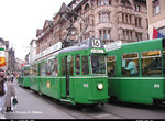 The most modern car type in the BVB fleet is the troubled Siemens Combino, a multi-section articulated unit which is principally to be found on routes 6 and 8. 28 of these vehicles are operated, and at 43 metres long they were the longest Combinos produced until a batch began construction for Budapest - which dwarf Basel's at a mammoth 54 metres! As with many other batches of Combinos produced for European cities, Basel's suffered from insufficient rigidity in the bodyshell owing to a hiccup in the type's technical specifications. Thus - at Siemens' edict - all will return to the factory for major rectification work to be carried out. A period of tram shortages as a result of this problem led to some of suburban operator BLT's orange and yellow units being lent to BVB to provide cover.