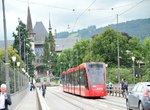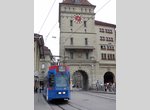 Bern Combino tram no. 670 in the Old City on Marktgasse, approaching Zytglogge. Photo by David Pirmann, July 2012.